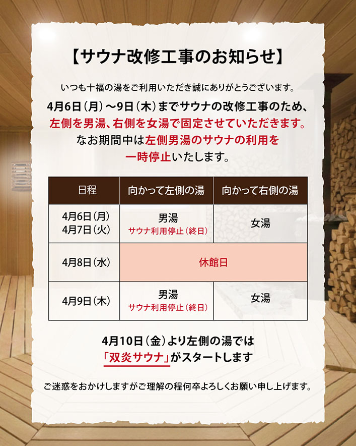 いつも十福の湯をご利用いただき誠にありがとうございます。4月6日(月)~9日(木)までサウナの改修工事のため、左側を男湯、右側を女湯で固定させていただきます。なお期間中は左側男湯のサウナの利用を一時停止いたします。ご迷惑をおかけしますがご理解の程何卒よろしくお願い申し上げます。